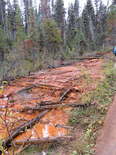 Er zijn 3 paint pots. Om er te komen moet je eerst over de brug over de rivier, dan links en dan kom je op de paden naar de paint pots. Voor de brug zit een golden mantled squirrel. Zo een met sportstrepen dus. De eekhoornvakantie gaat verder. De grond verkleurt al. Het is heel mooi, maar ook heel modderig. Aan de linkerkant loopt een stroompje over oud hout. Op het pad ernaast liggen soms planken om over de ergste plassen en modder te kunnen komen. Aan het eind van de 1e sectie ligt een mooie, groen gekleurde poel. Daarachter loopt nog een pad, naar de andere paint pots. Het eerste stuk is een soort plankier. Een beetje gammel, maar het werkt. Verderop houdt dat op en stijgt het pad sterk. De grond is daar niet langer rood, maar zandkleurig. En verschrikkelijk modderig en glad. Jan stapt mis en glijdt uit. Hij ligt languit in de modder. Gelukkig niets bezeerd, maar we gaan toch maar terug om wat schoons aan te doen. Handig dat we de camper hebben; alles bij de hand en de ruimte om je om te kleden.